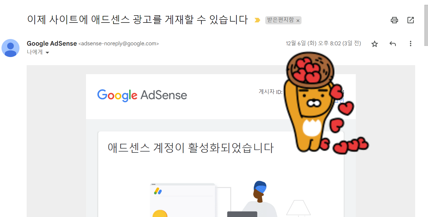 12월 6일에 승인이 났습니다. 11월 28일에 신청했으니 9일만에 났네요!!ㅎㅎ 그러고보니 이틀정도는 글쓰는걸 빼먹었나봅니다..ㅎ 그래도 승인나게 해준 구글선생님들 감사합니당ㅋㅋㅋㅋ